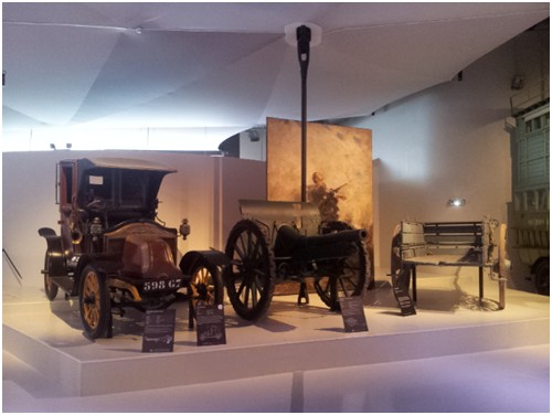 Nous y voyons les premiers avions de guerre, un taxi de la bataille de la Marne, un camion chargé de transporter les pigeons voyageurs, un char Renault, des masques à gaz, des grenades, des obus et tant d’autres choses.