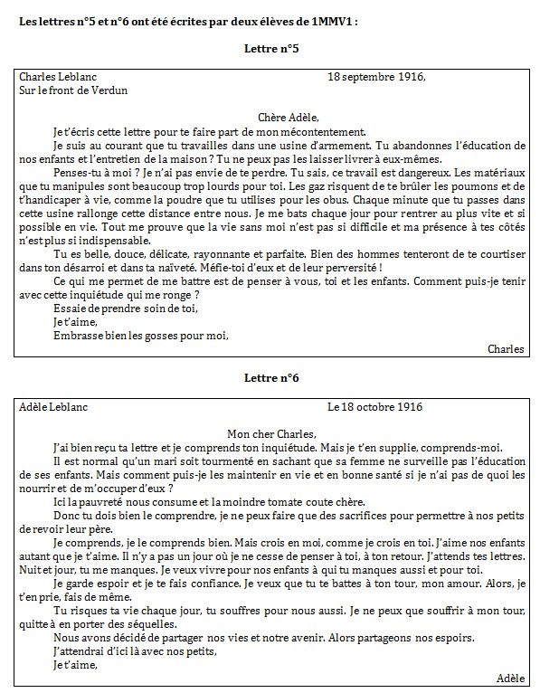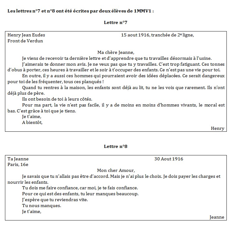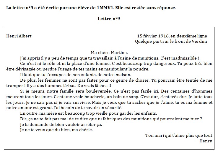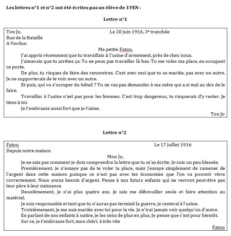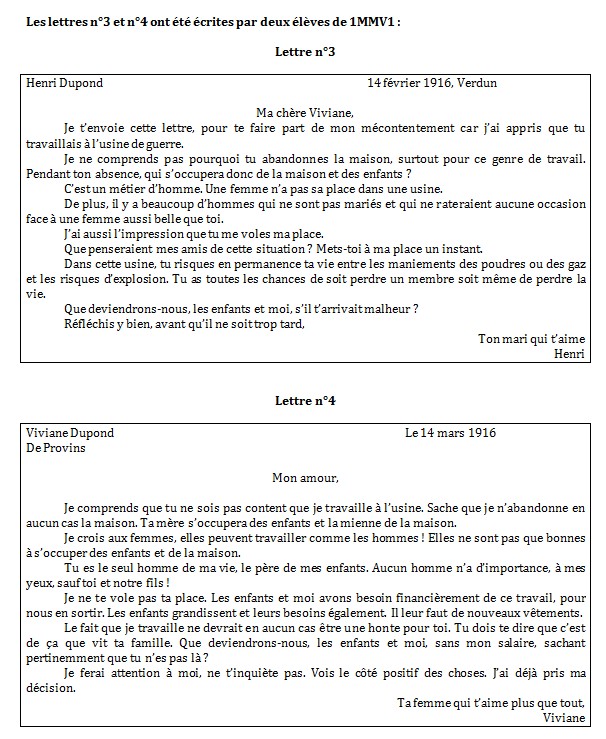 Au cours d’une séance d’accompagnement personnalisé portant sur les femmes dans la Première Guerre mondiale, nous avons évoqué ces femmes travaillant dans les usines d’armement et, plus particulièrement, sur leurs motivations et sur le regard que l’on pouvait porter sur elles, à cette époque.Il nous a été demandé d’imaginer deux lettres : une première écrite par un soldat depuis le front demandant à son épouse d’arrêter de travailler dans ce genre d’établissement et une seconde qui serait la réponse de cette dernière.
